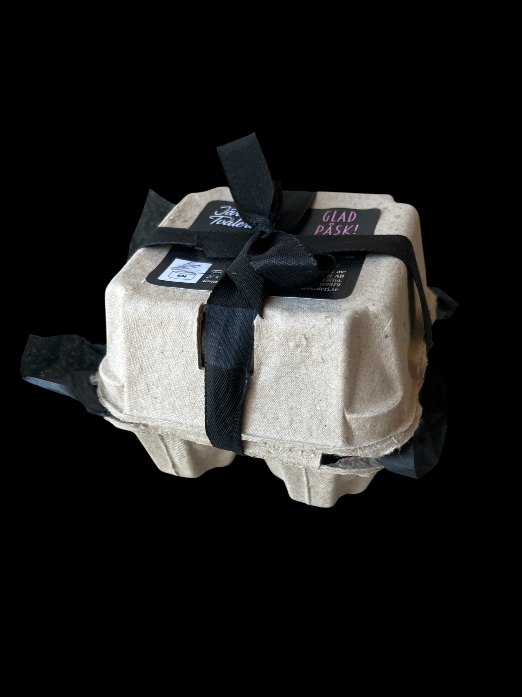 Äggkartongen kommer inslagen med ett presentband runt, etikett utanpå och innehållsförteckning i locket.