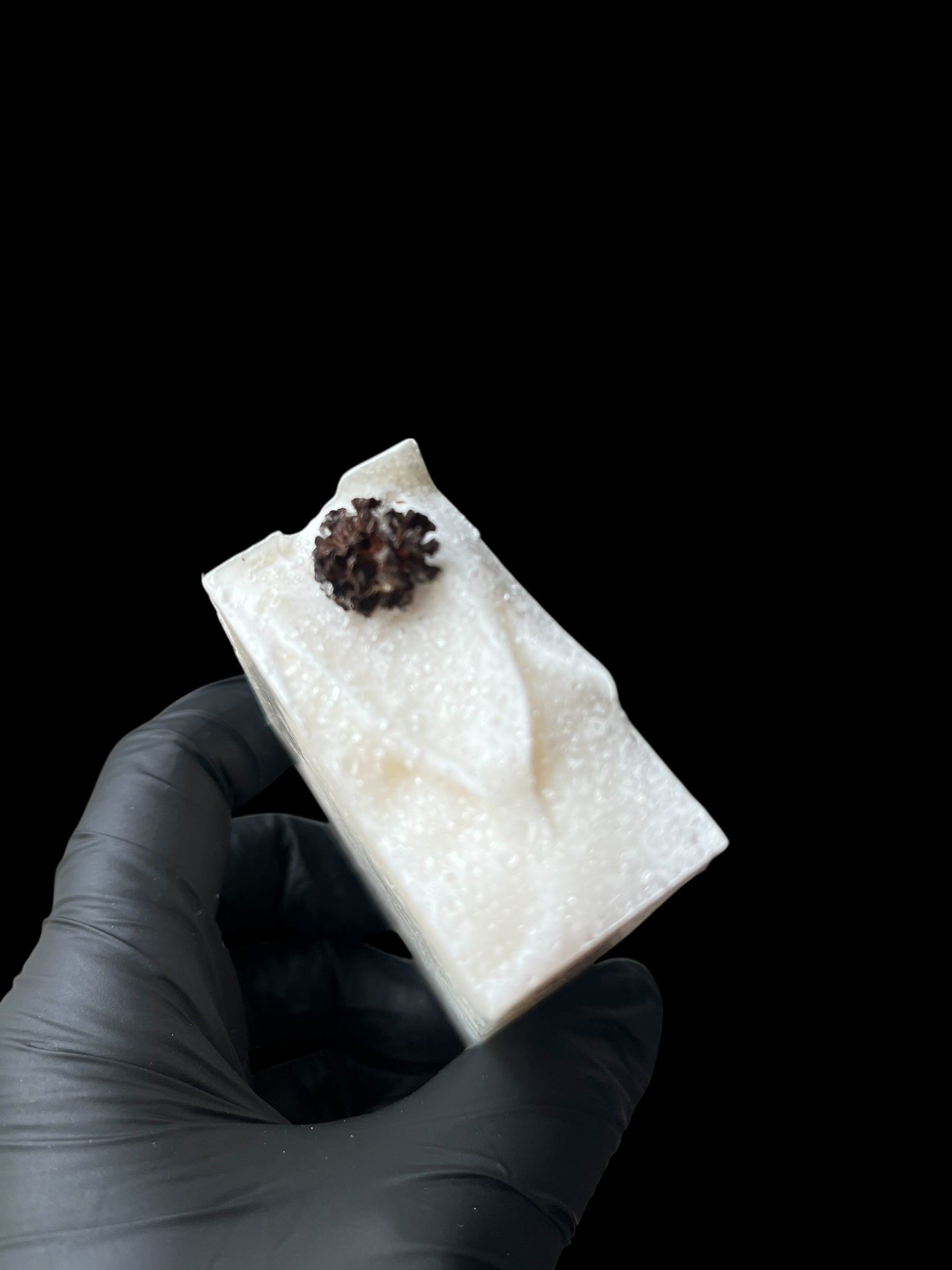 Det här är en fräsch snöimitation - en helt vit salttvål med frisk utomhusdoft, dekorerad med en liten alkotte och gnistrande små sockerskristaller.