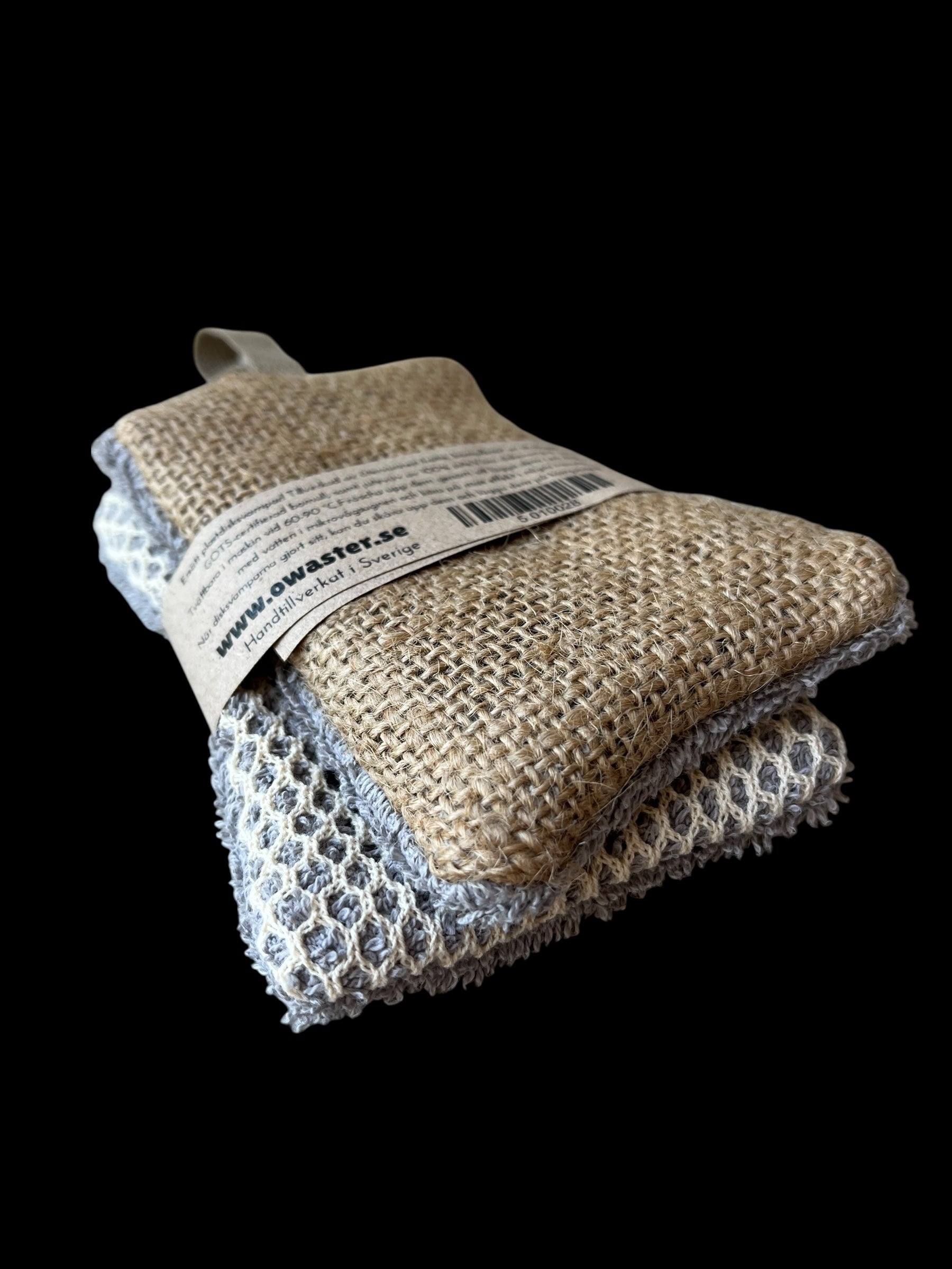Två stycken superfina lokalt producerade "ickedisksvampar" av återanvänd frotté och GOTS-certifierade textiler. Ena svampen har en mjukare skrubb från ett bomullsnät och kan även användas för kroppsskrubb. Den andra är grövre med en sida av juteväv.
