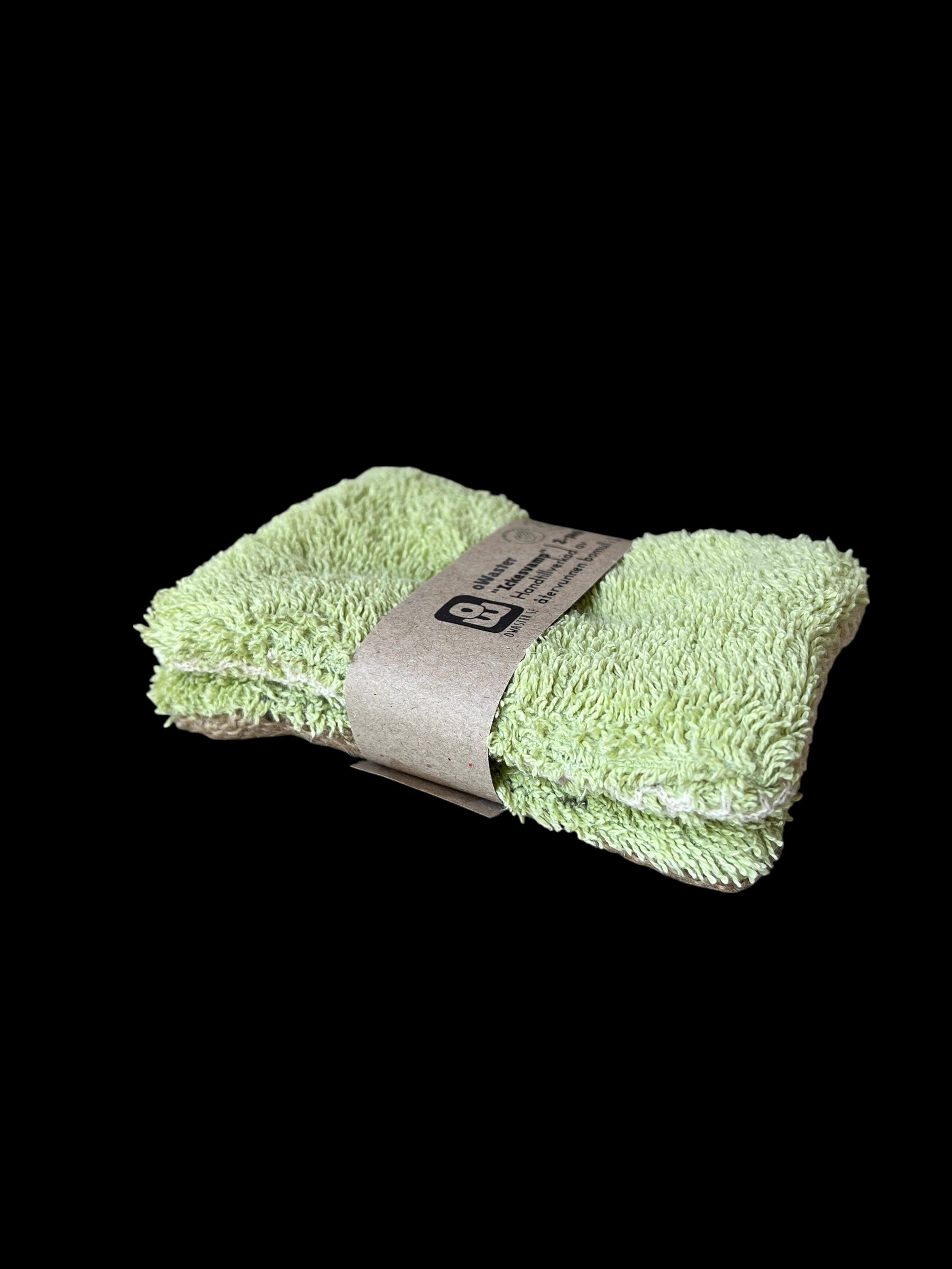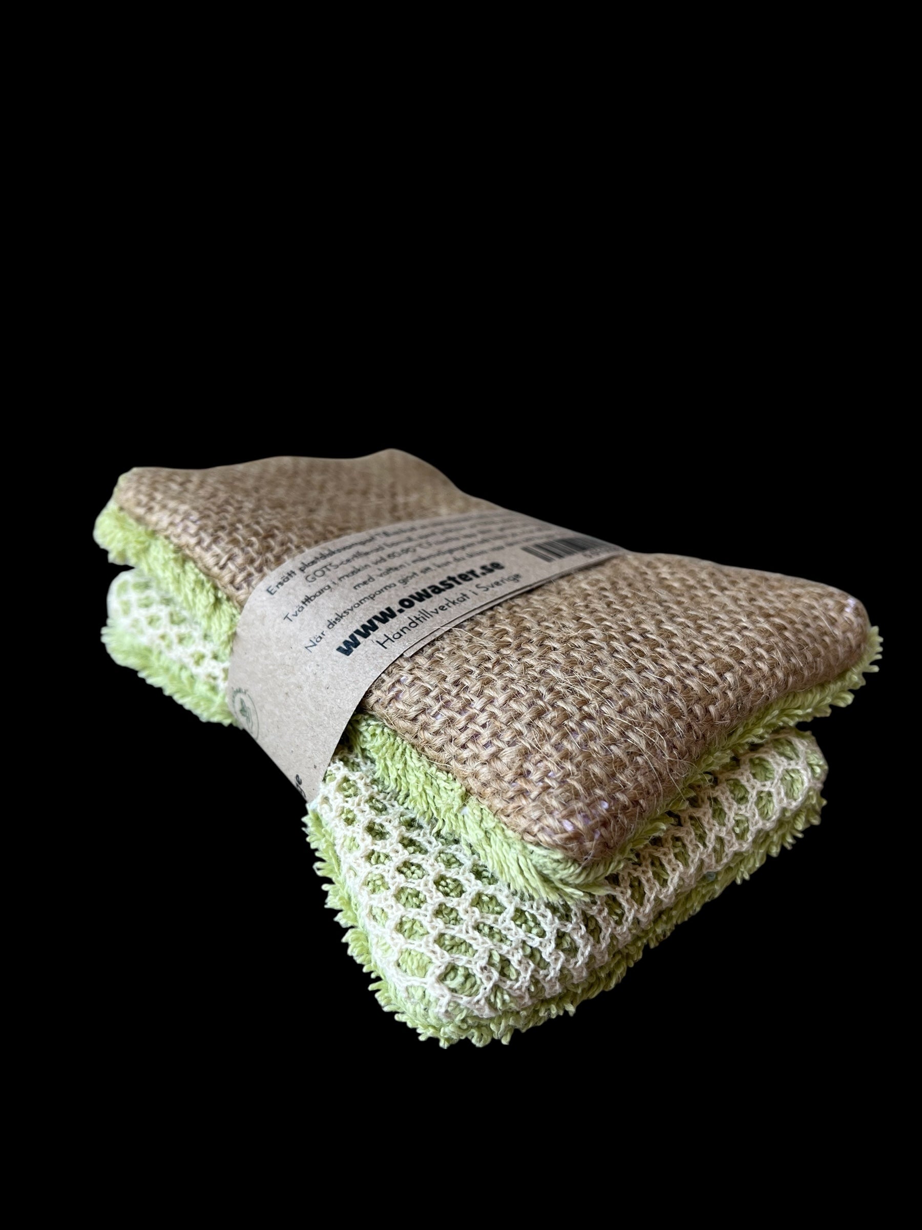 Två stycken superfina lokalt producerade "ickedisksvampar" av återanvänd frotté och GOTS-certifierade textiler. Ena svampen har en mjukare skrubb från ett bomullsnät och kan även användas för kroppsskrubb. Den andra är grövre med en sida av juteväv.