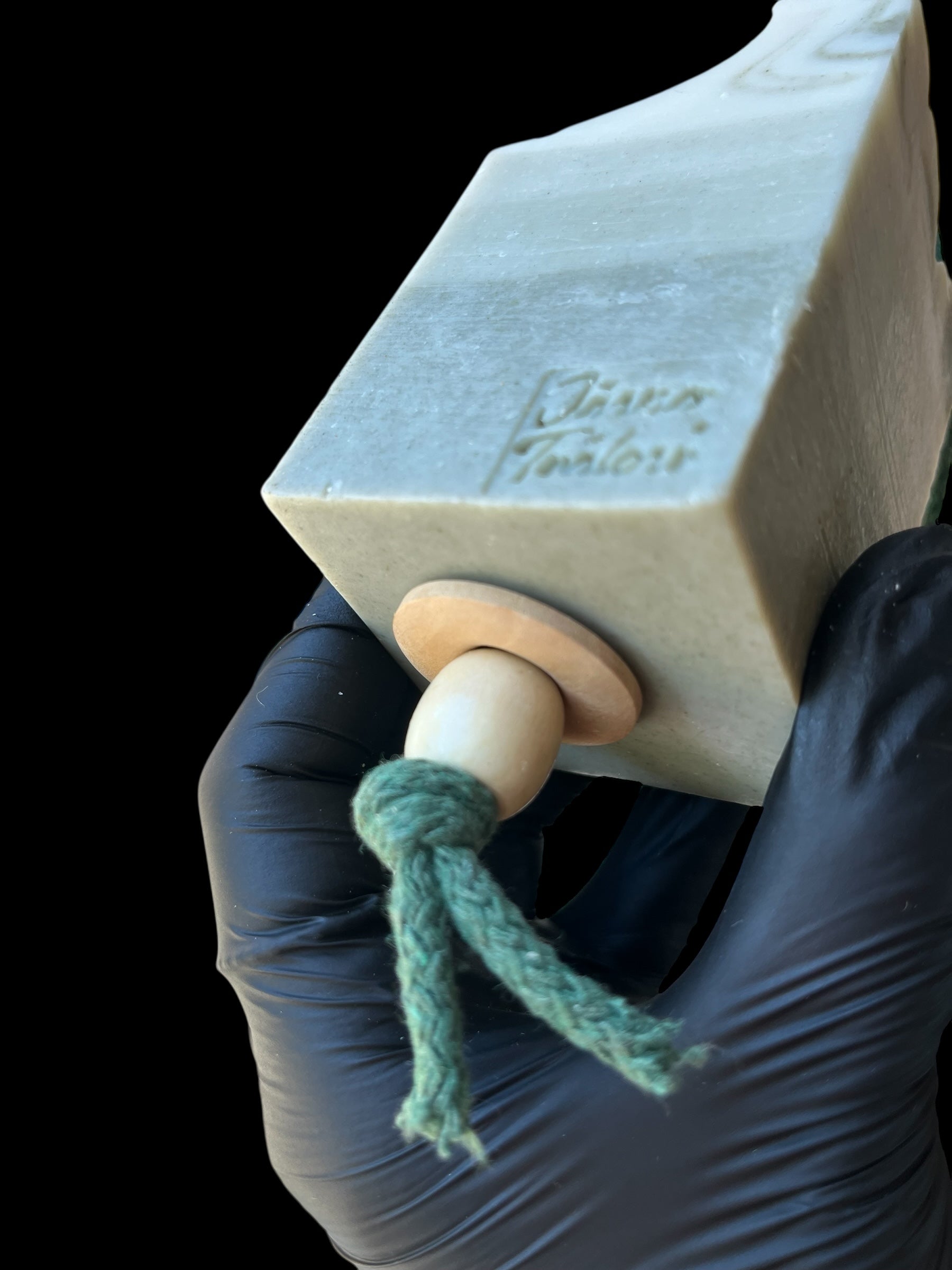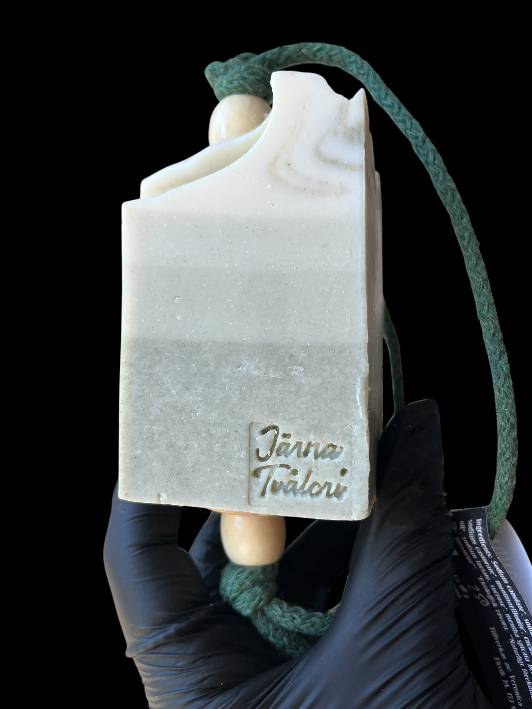 Denna tvål är upphängd på grönt bomullssnöre (OEKO-tex klass 1) med en trädiskus i botten och två stycken målade träpärlor. Att hänga upp tvål gör att de torkar snabbt och håller sig fräscha länge.