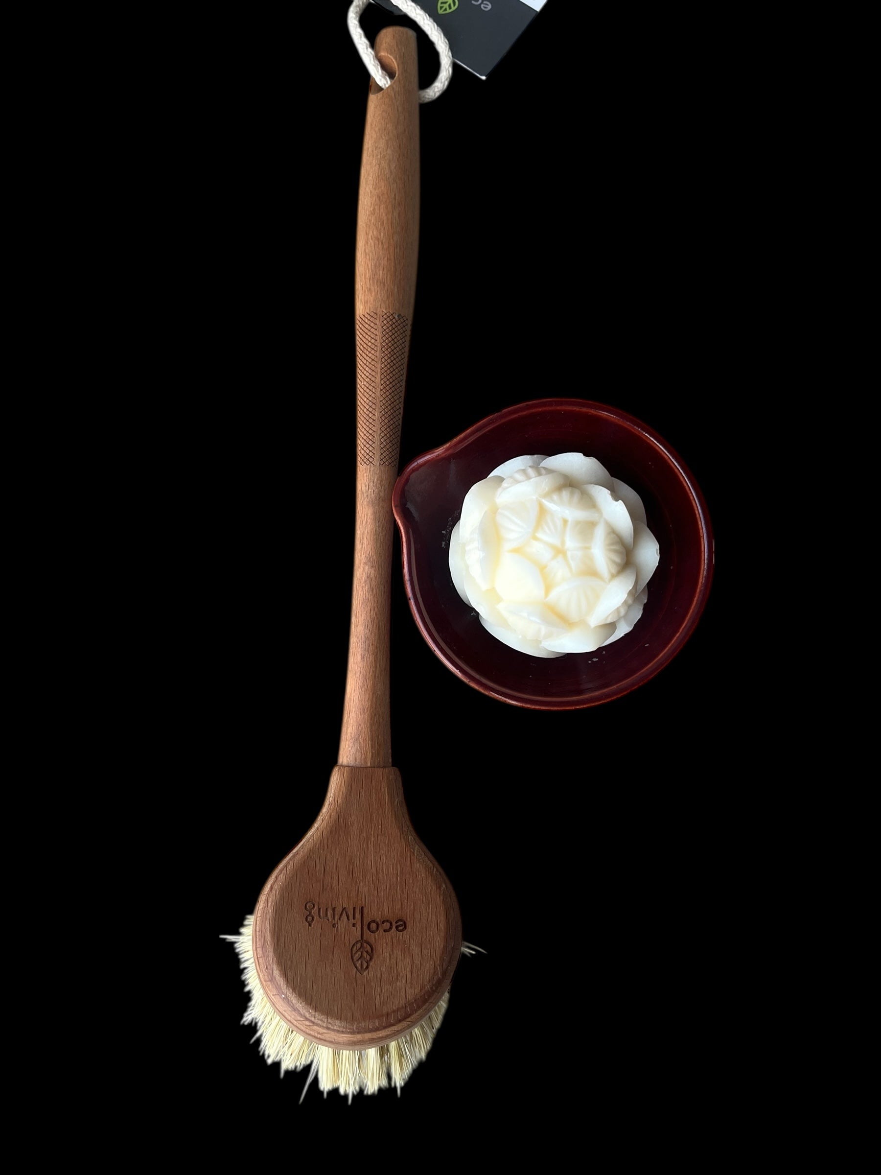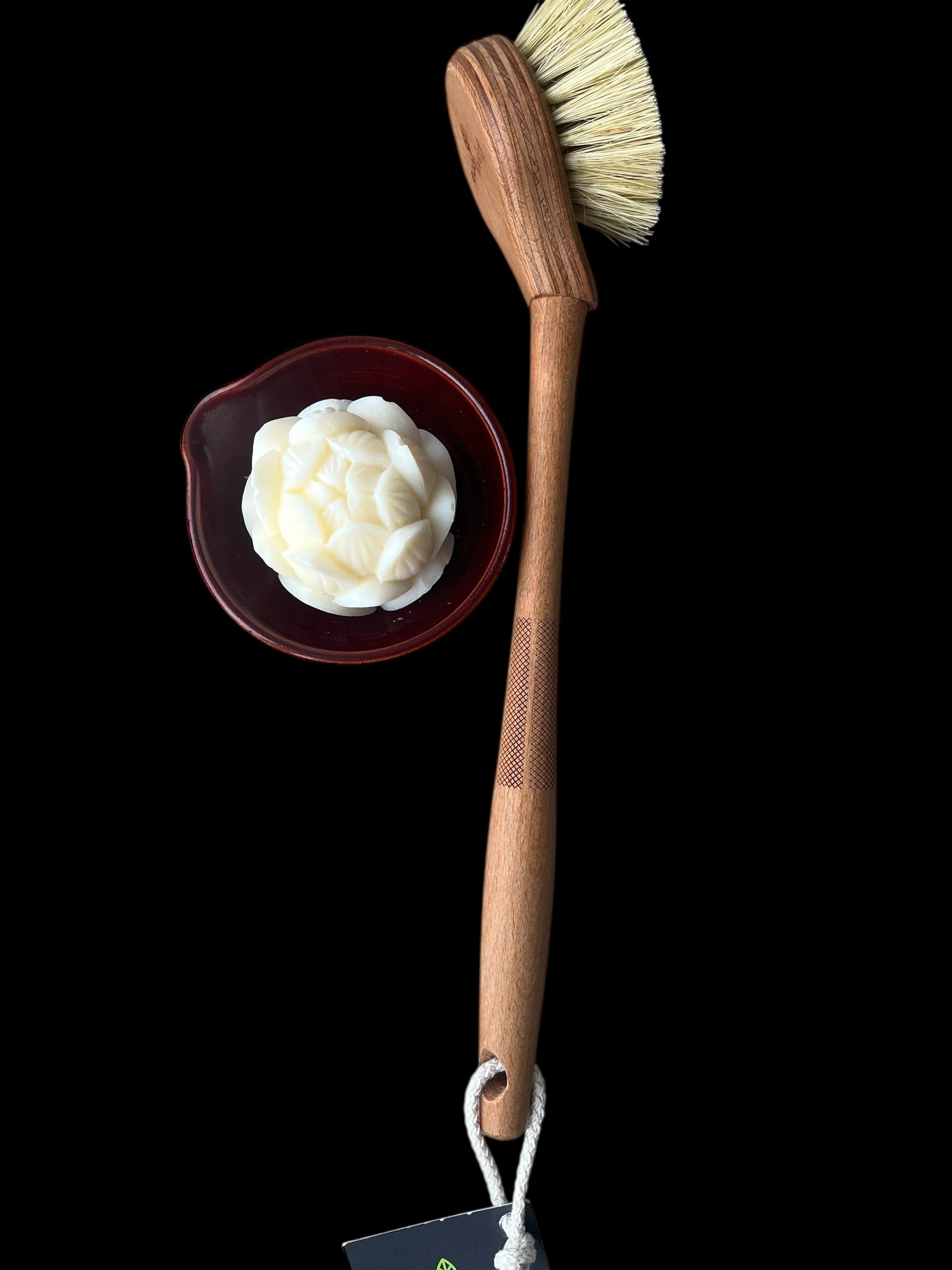 En jättefin julklappskombination med diskstvålen Vit lotus, en djupröd disktvålsskål och vår allra finaste diskborste med långt skaft.