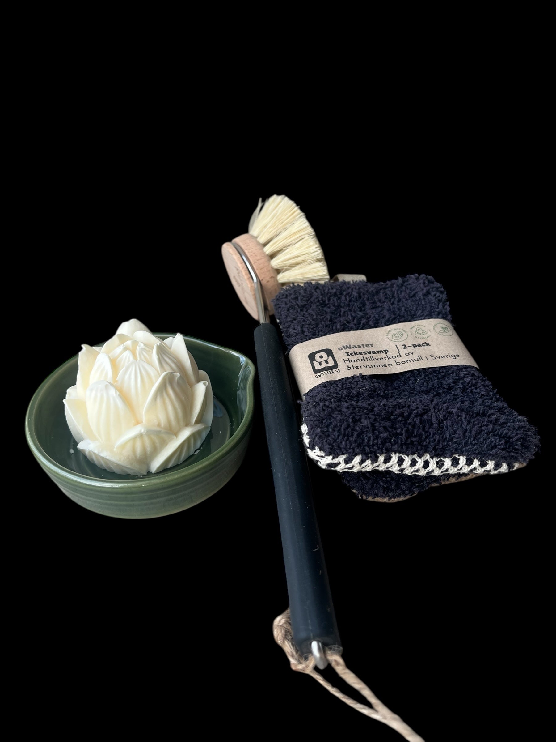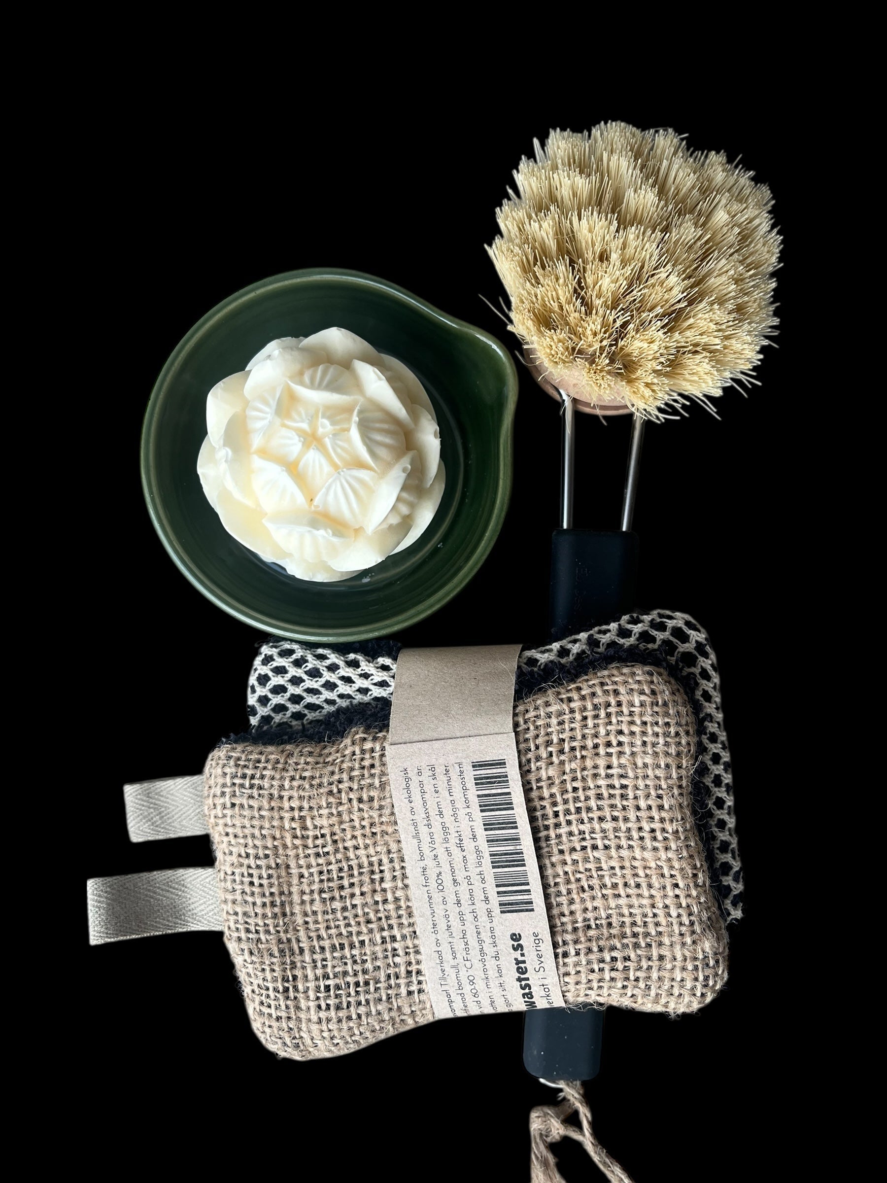 En jättefin julklappskombination med diskstvålen Vit lotus, en grön disktvålsskål, ett par svarta ickesvampar och en diskborste med svart silikonskaft.