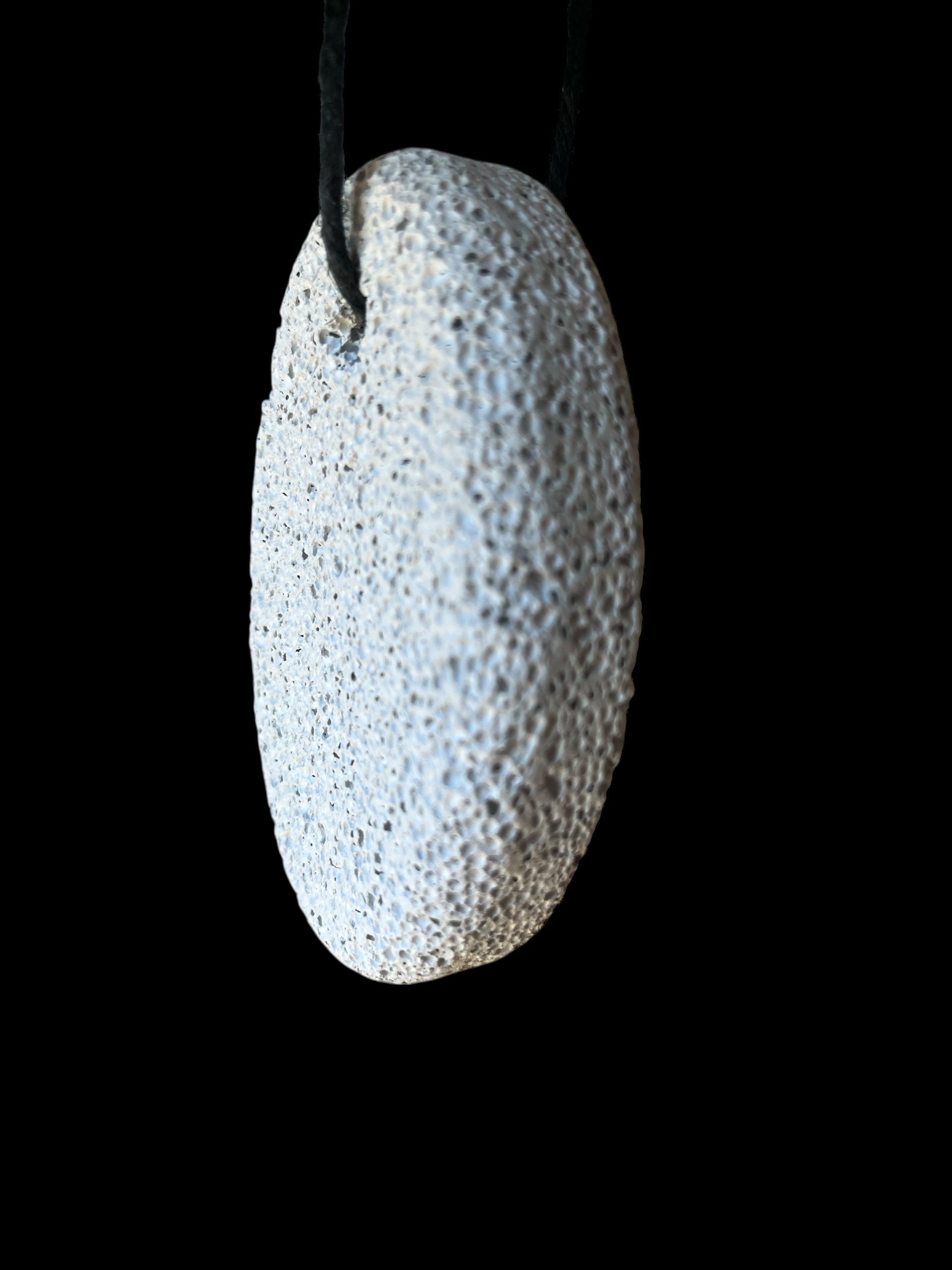Naturlig vit/grå lavasten med cirka mått 9 x 6 x 2 cm upphängd på ett svart hampasnöre.