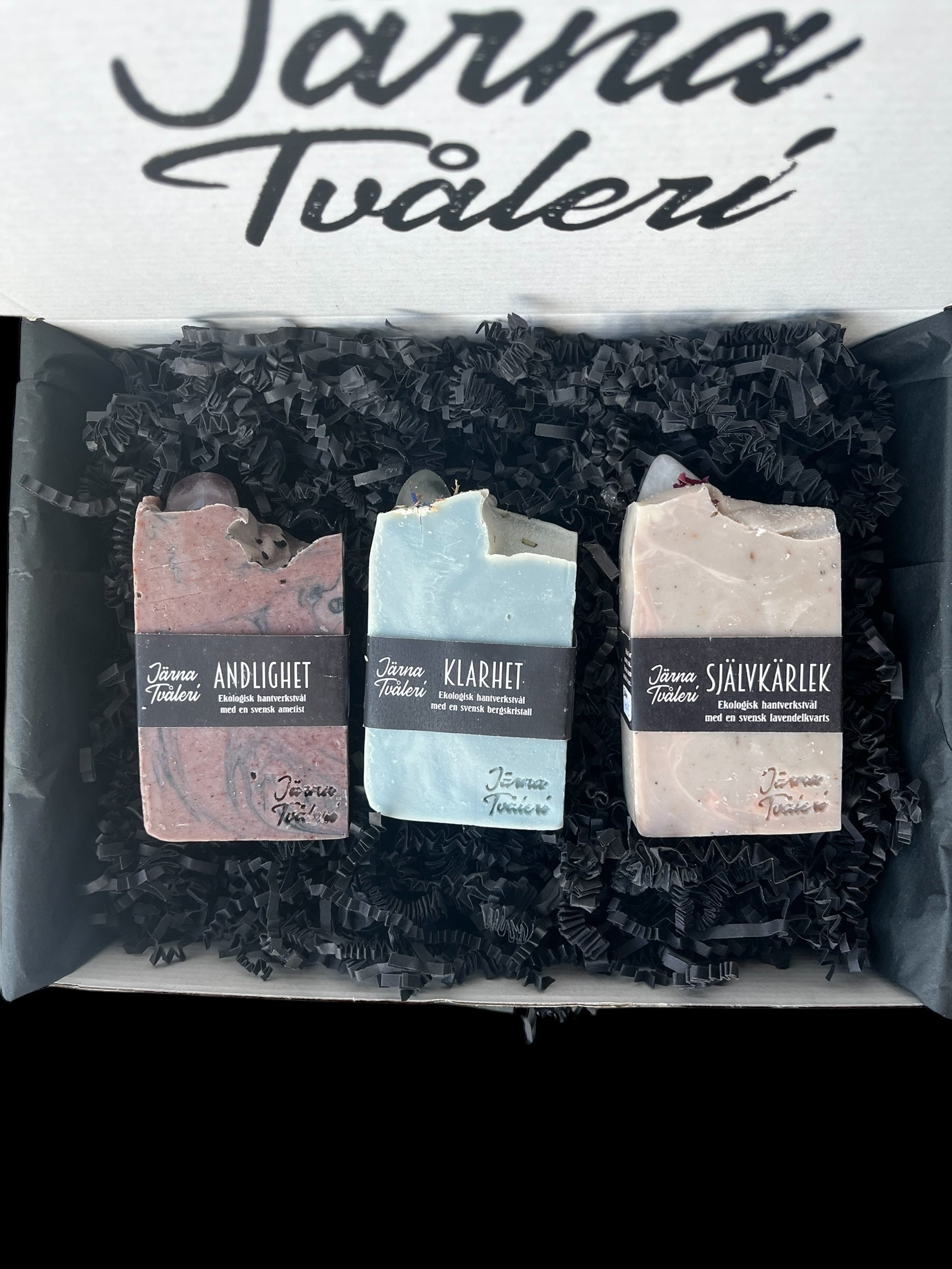 Här får du alla våra vackra kristalltvålarna inslagna i en svart papperslåda med ett presesentband runt.