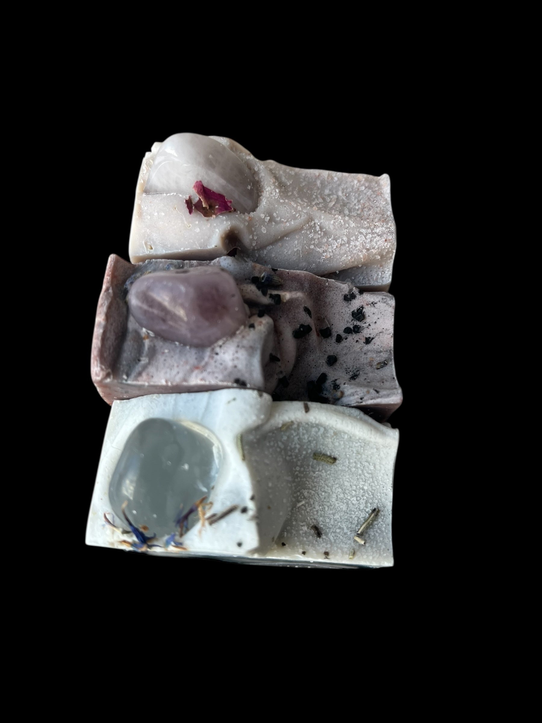 Detta är en unik tvål dekorerad med en vacker svensk trumlad lavendelkvarts (minst 5 gram).