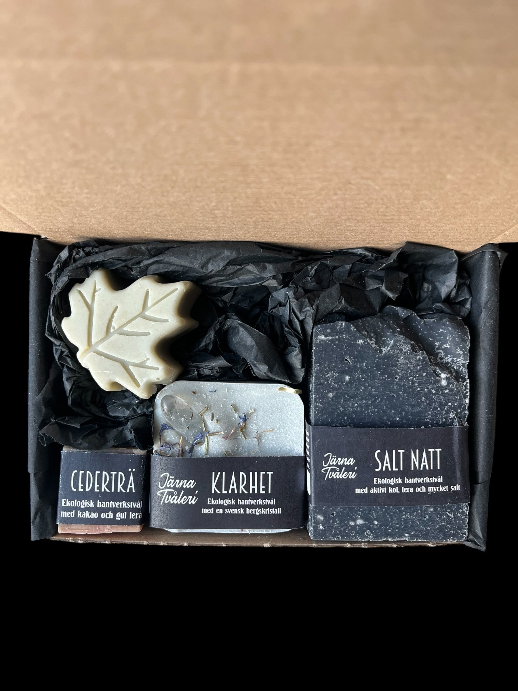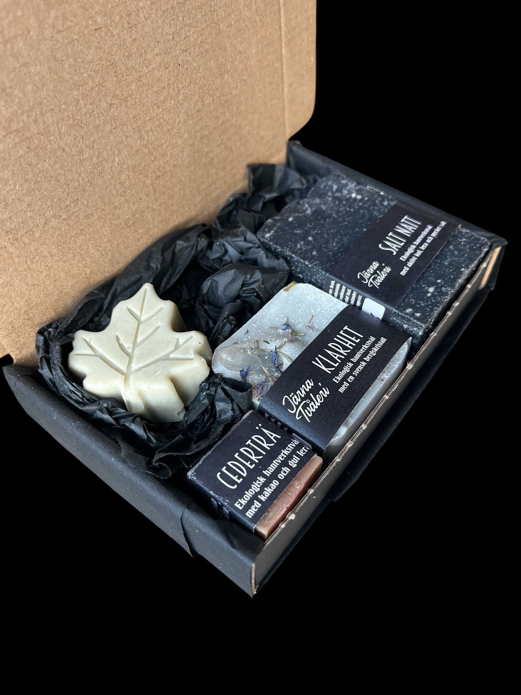 En enkel liten presentlåda innehållandes fyra tvålar - en fullstor Salt natt (120 gram) en liten Cederträ (25 gram), en Klarhet med bergskristall (65 gram) samt ett löv som prov på tvålen Morgondagg.