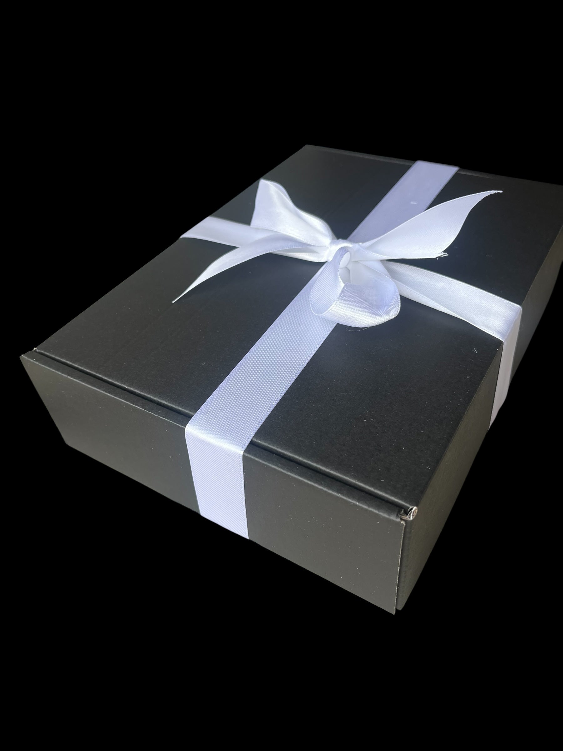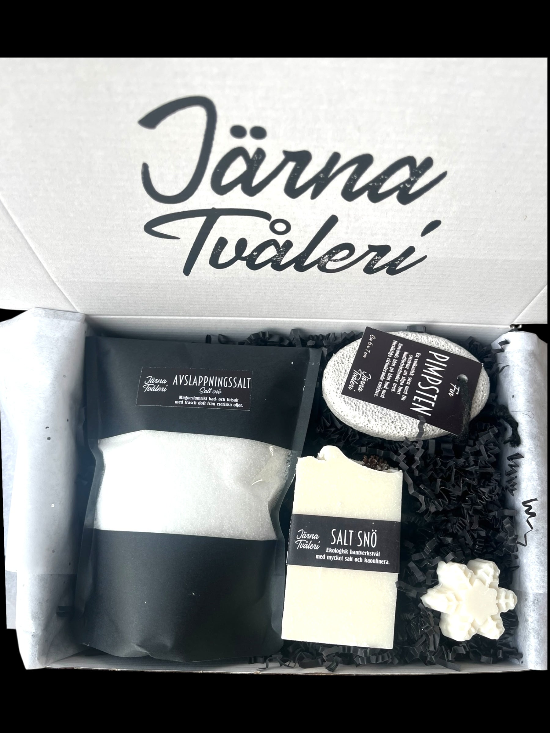 En stiligt inslagen svart/vit presentlåda med fyra vintriga produkter och en doft som de flesta tilltalas av.