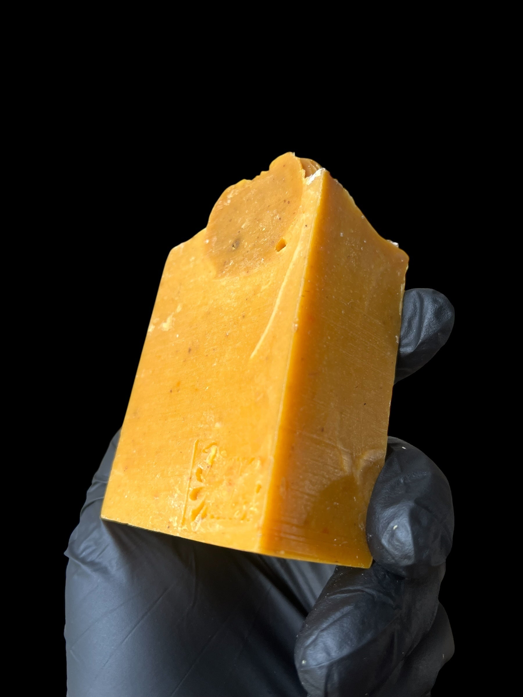 Denna tvål doftar kryddigt av kanelblad, ingefära, kryddnejlika och muskotnöt. Färgerna på tvålen kommer från havre, gurkmeja, annattofrön och saffran.